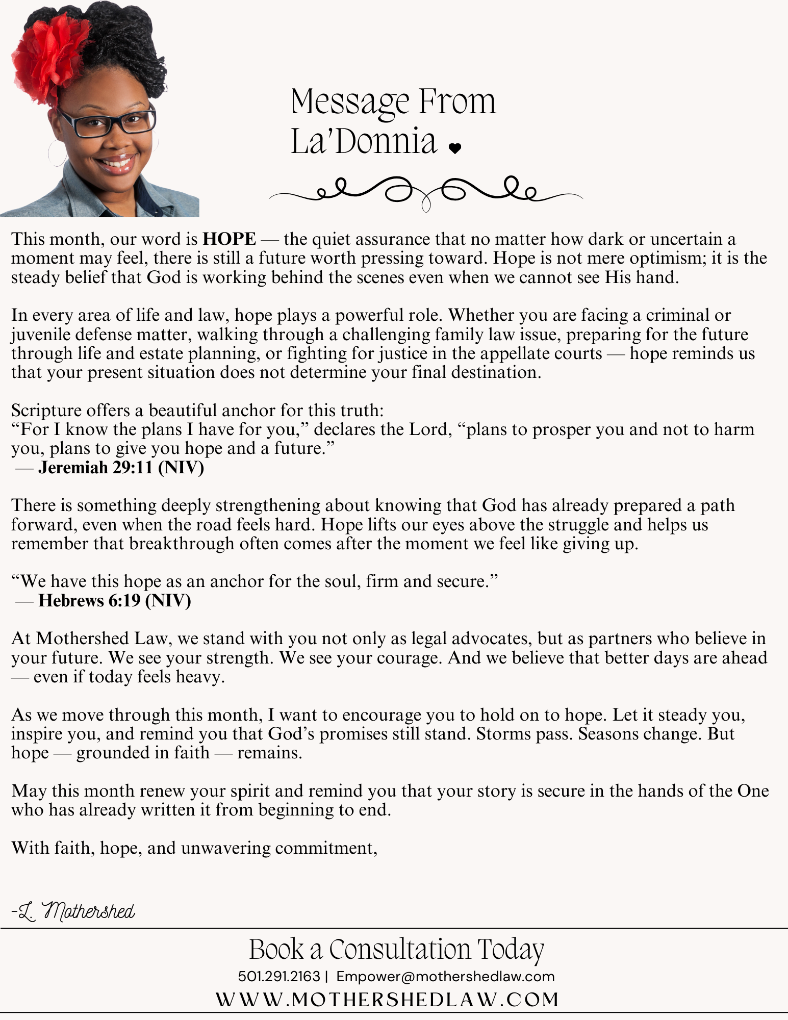 Empower State of Mind: Hope Empower State of Mind Dec 1 Written By La'Donnia M. Mothershed Esq. Word of the Month La'Donnia M. Mothershed Esq. https://www.mothershedlaw.com/meet